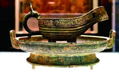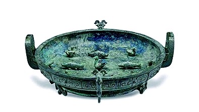 从出土文物来看,匜就像带把儿的瓢,随着技术的进步和人们审美的变化,开始出现各种图案和造型的匜,前部有了“流”(泻水之用),后部有了“鋬”(把持之用),有的底部还加了足。古人洗手的时候,一般先拿着匜舀水、浇水,并用“槃”(即“盘”)来接水,《说文解字》中说:“槃,承槃也。”段玉裁注曰:“承槃者,承水器也。”还提及“古之盥手者,以匜沃水,以槃承之,故曰‘承槃’”。